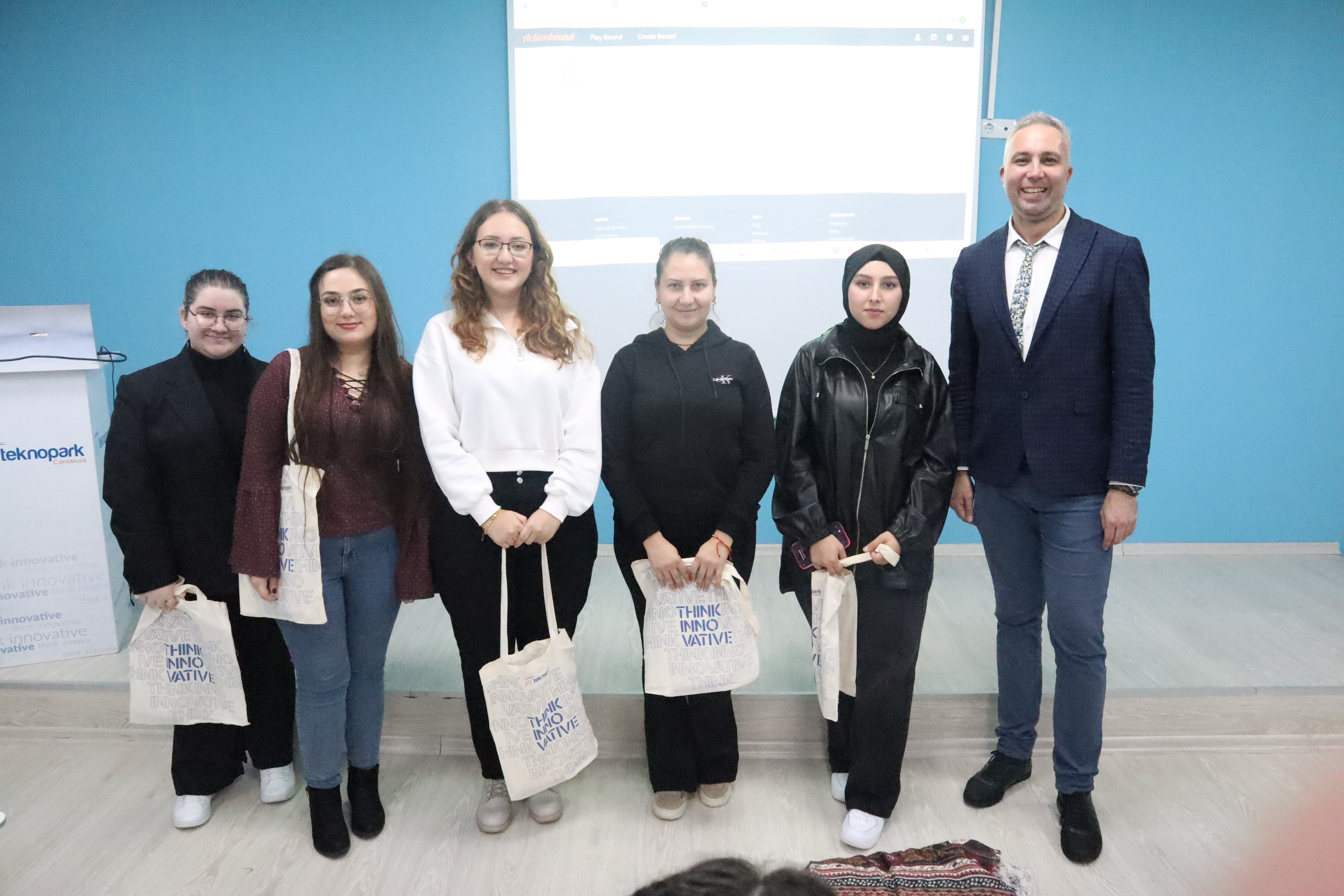 Çanakkale Teknopark Teknoloji Transfer Ofisi Uzmanı ve Üniversitemiz Eğitim fakültesi akademisyenlerinden Dr. Öğr. Üyesi Leyla Ayverdi ve Eğitimci Dr. Yunus Emre Avcu tarafından Çanakkale Teknopark’ta “Tasarım Odaklı Düşünme Atölyesi” gerçekleştirildi. Eğitim gün boyunca teorik ve uygulamalı çalışmalar ile devam etti, eğitimin sonunda eğitime katılım sağlayan öğrencilere Çanakkale Teknopark' tan katılım belgesi ve Sürekli Eğitim Merkezi'nden(SEM) sertifika verildi.